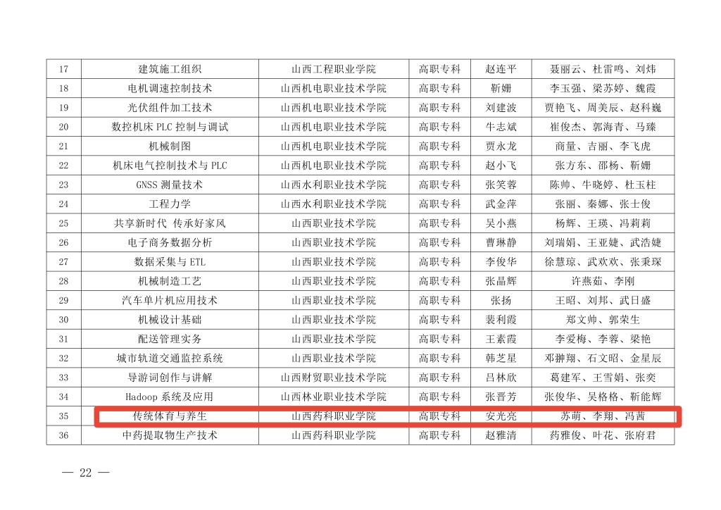 近日,山西省教育厅发布《关于公布2025年山西省职业教育“金课”名单的通知》(晋教职成函〔2025〕88号),山西药科职业学院安光亮、苏萌、李翔三位教师团队打造的《传统体育与养生》课程,成功入选省级线上“金课”,这是该校在职业教育课程建设领域的又一重要成果。
