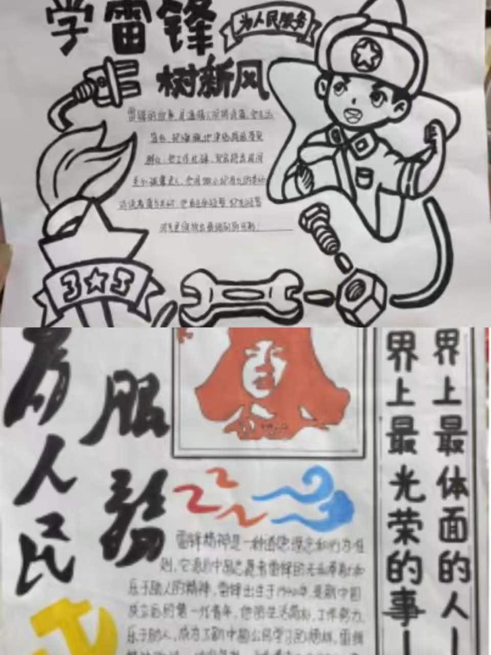 本次雷锋手抄报活动中,同学们充分发挥想象力和创造力,绘画风格多样、色彩搭配鲜明,展现出极强的动手能力和审美水平。有的同学以简约清新的线条勾勒出雷锋同志助人为乐的经典场景,笔触细腻、形象生动;有的同学采用色彩饱满的漫画风格,将雷锋精神与校园生活、志愿服务相结合,活泼又富有感染力;还有的同学融入传统元素,以水墨笔触烘托氛围,让雷锋形象更具厚重感,每一幅作品都凝聚着同学们对雷锋同志的崇敬与赞美。