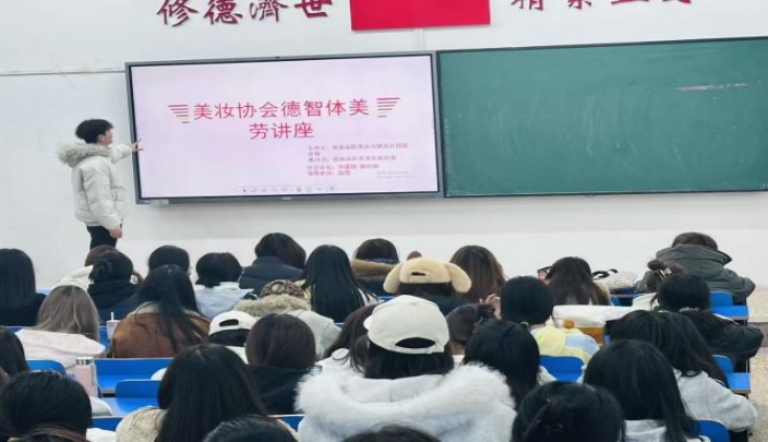 主讲人通过PPT演示,讲解日常化妆的基础流程(底妆、眼妆、唇妆等)、不同肤质的美妆产品选择、美妆工具的清洁与保养等专业内容,夯实学生美妆知识基础,提升“智育”维度的专业认知。结合社交场景(如面试、校园活动、日常交往),讲解妆容的适配性原则,强调“妆容得体是尊重他人、展现自我素养的方式”,引导学生树立正确的审美礼仪观,将“德育”融入美妆实践。