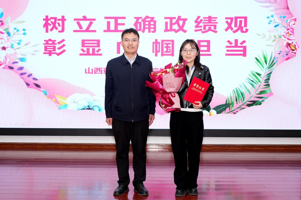 庄东军为食品系颁发奖牌和证书,为刘利娜老师颁发证书并送上鲜花。他充分肯定了全院女教职工在学院发展中撑起“半边天”的重要作用和中坚力量,对食品系、刘利娜老师获得的荣誉表示祝贺,并向全体巾帼教职工致以诚挚问候。他强调,全体女教职工要以先进为榜样,紧紧围绕立德树人根本任务,在学院“双高”建设攻坚和“十五五”规划开局的关键阶段,勇担使命、奋勇争先,为创建全国一流药科类职业院校、助力山西经济社会高质量发展贡献巾帼力量。