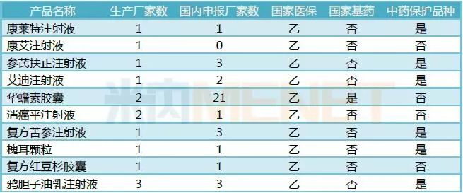 产品TOP10均是医保乙类,其中,康莱特注射液、参芪扶正注射液、艾迪注射液、复方苦参注射液等6个产品是中药保护品种;华蟾素胶囊是国家基药。值得一提的是,这10个产品中有7个是独家。