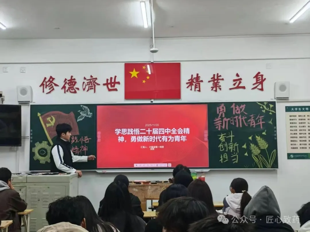 2025年10月20日至23日中国共产党第二十届中央委员会第四次全体会议在北京胜利闭幕,会议审议通过了“十五五”规划建议,为我国未来发展擘画宏伟蓝图,11月5日,制药系分团委组织各团支部开展“学思践悟二十届四中全会精神,勇做新时代有为青年”主题团课,各团支部书记带领同学们集中学习全会相关内容、观看视频并分享认识感悟,大家明确深入学习全会精神与《建议》部署是把握国家大势、践行青年使命的重要起点,此次活动既是思想洗礼也是行动动员,学子们表示将把学习成果转化为动力与行动自觉,以昂扬姿态投身社会主义现代化建设,为民族伟大复兴书写青春篇章。