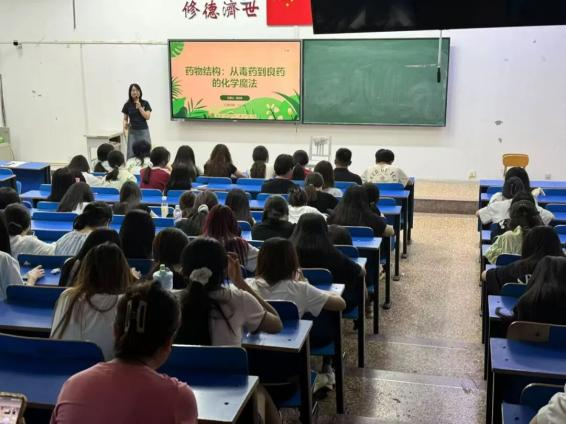 金属有机配合物在药物研发中的应用前景。他结合自身研究经历,详细阐述了如何通过精准的分子设计优化金属配合物的结构,以增强其生物活性和靶向性。张博士还分享了近年来该领域的重要突破,尤其是抗癌药物和抗菌药物研发中的典型案例,激发了在场同学对创新药物设计的浓厚兴趣。随后,岳志珠博士以《药物结构:从毒药到良药的化学魔法》为题,生动解析了药物化学中的结构修饰策略。她通过历史上经典药物的发现历程(如阿司匹林、青霉素等),展示了如何通过化学修饰将有毒物质转化为安全有效的治疗药物。岳博士强调,药物结构的微小改变可能带来药理活性的巨大差异,并鼓励同学们关注基础研究与临床应用的结合。