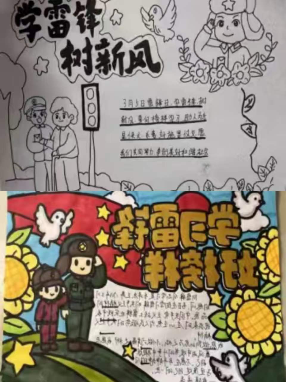 本次雷锋手抄报活动中,同学们充分发挥想象力和创造力,绘画风格多样、色彩搭配鲜明,展现出极强的动手能力和审美水平。有的同学以简约清新的线条勾勒出雷锋同志助人为乐的经典场景,笔触细腻、形象生动;有的同学采用色彩饱满的漫画风格,将雷锋精神与校园生活、志愿服务相结合,活泼又富有感染力;还有的同学融入传统元素,以水墨笔触烘托氛围,让雷锋形象更具厚重感,每一幅作品都凝聚着同学们对雷锋同志的崇敬与赞美。