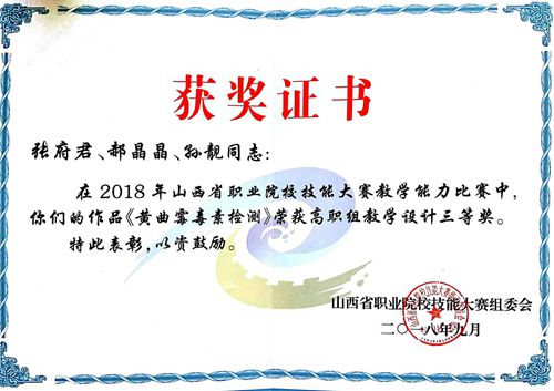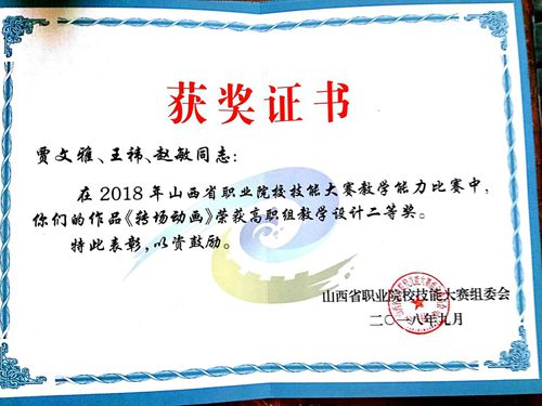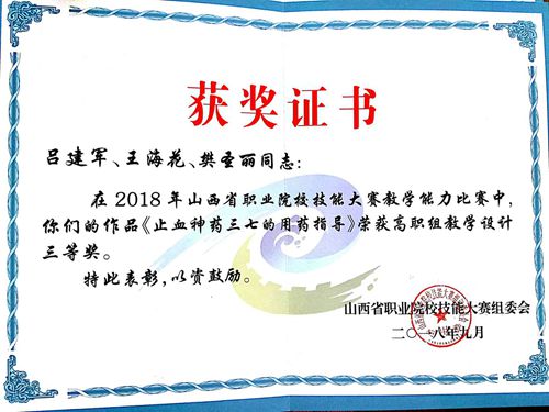 在刚刚落下帷幕的2018年山西省职业院校技能大赛教学能力比赛中,我院教师取得高职组信息化教学设计比赛二等奖一项、三等奖三项的好成绩,其中,贾文雅、王祎、赵敏的作品《转场动画》获教学设计二等奖,吕建军、王海花、樊圣丽的作品《止血神药三七的用药指导》获教学设计三等奖,张玮玮、杨东方、程强老师的作品《西洋参的鉴定》获教学设计三等奖,张府君、郝晶晶、孙靓的作用《黄曲霉素检测》获教学设计三等奖。并且张玮玮、杨东方、程强老师的作品还被省教育厅选送参加2018年全国职业院校教学能力比赛,这充分展示了我院教师过硬的教育教学水平和综合素质,也反映出我院在教育教学改革、师资队伍建设等方面的建设成果。