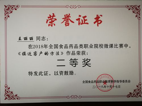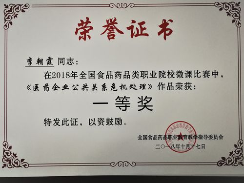 近日,在2018年全国食品药品类职业院校微课比赛中,我院教师分别取得一等奖1个、二等奖1个、三等奖10个的优异成绩。其中,李朝霞的作品《医药企业公共关系危机处理》获一等奖;王丽丽的作品《接近客户的方法》获二等奖;张府君、郝晶晶、孙靓的作品《冰片中砷盐的检测—古蔡氏法测砷》,樊圣丽的作品《滋阴石斛救命仙草》,景晓琦的作品《焦山楂炮制技术》,杨东方的作品《一字差“千金”的西红花和红花》,张玮玮的作品《金银花的显微世界》,张乾、李朝霞、张丽的作品《针对消费者的医药营业推广》,韩勇的作品《高压蒸汽灭菌锅的结构》,赵小艳的作品《水飞朱砂》,刘文娟、王祎、陈湘玲的作品《高血压的用药指导》,卫军锋的作品《温情式药品零售方法》分获三等奖。