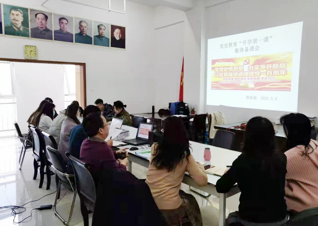 为贯彻落实中共山西省委教育工作委员会 山西省教育厅“关于组织开展党史教育‘开学第一课’活动通知”精神,进一步做好我院党史学习教育,3月5日下午,思想政治理论教学研究部在学院综合楼524办公室开展了党史教育“开学第一课”集体备课会,备课会由思政部主任李英平主持,思政部全体教师参加了本次会议。