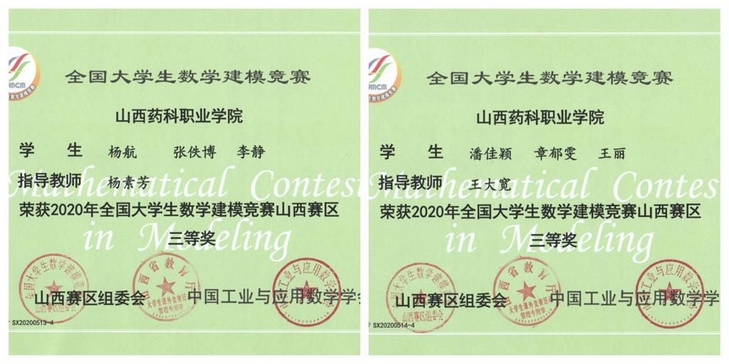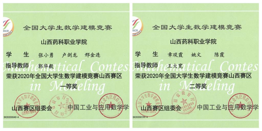 4月24日上午,2020年全国大学生数学建模竞赛山西赛区颁奖仪式在山西机电职业技术学院进行,我院学生在此次比赛中取得优异成绩。其中张小勇、卢剑龙、邢金连荣获山西赛区一等奖,章琰霞、姚文、陈霞荣获山西赛区二等奖,杨航、张佚博、李静、潘佳颖、章郁雯、王丽荣获山西赛区三等奖。