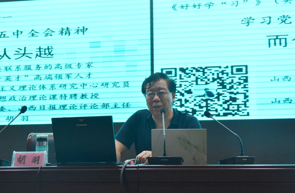 6月9日下午,学院邀请山西日报报业集团编委、中共山西省委联系服务的高级专家、“三晋英才”胡羽教授在综合楼一层报告厅为我院师生讲授党史学习教育专题讲座,讲座由组织人事部部长主持,各党总支、党支部书记,思政部全体人员以及学生代表参加了讲座。