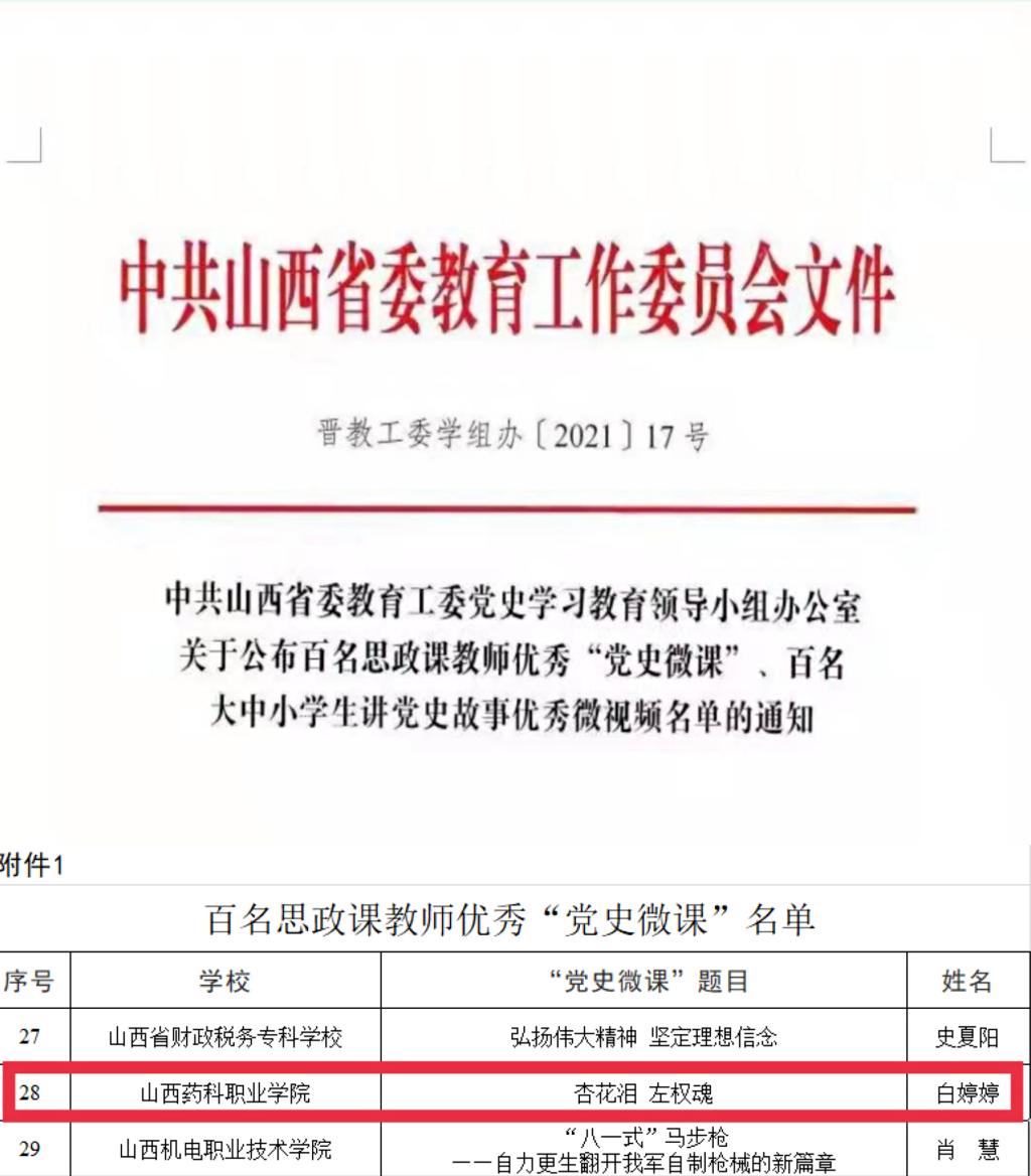 日前,省教育厅以及省委教育工委党史学习教育办公室分别公布了2021年度山西省职业教育教学名师名单和百名思政课教师优秀“党史微课”名单。我院教师杜月莲获得“2021年度山西省职业教育教学名师”荣誉称号,教师白婷婷主讲的《杏花泪 左权魂》入选百名思政课教师优秀“党史微课”。