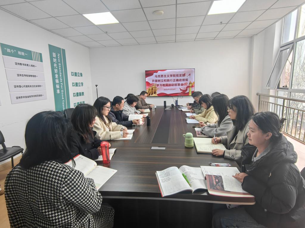 2026年3月6日下午,马克思主义学院党支部召开专题会议,正式启动并安排树立和践行正确政绩观学习教育。会议深入学习贯彻习近平总书记关于树立和践行正确政绩观的重要论述,学习了中央、省委和省委教育工委树立和践行正确政绩观学习教育工作会议精神,传达了学院开展树立和践行正确政绩观学习教育启动部署会议精神,统一思想、明确任务,推动全体党员教师以正确政绩观引领学院思政教育高质量发展。