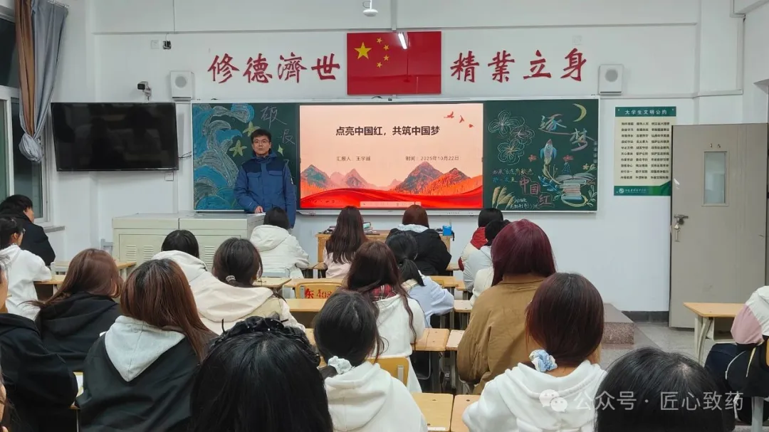 10 月 23 日,制药系组织各班团支部开展“点亮中国红,共筑中国梦”主题班会,围绕学习习近平总书记重要讲话精神、解读中国梦内涵、回顾“开学第一课”展开,通过视频重温总书记在抗战胜利系列纪念活动中的重要讲话,让同学们铭记历史、传承抗战精神,明确中国梦与青年个人理想的紧密关联,同时回顾院党委书记张轩萍讲授的“开学第一课”中关于“大学之大”的内涵阐释与殷切勉励,此次班会深化了同学们对爱国主义和中国梦的理解,激发了爱国热情与奋进斗志,大家表示将把个人成长融入国家发展,为实现中华民族伟大复兴的中国梦贡献青春力量。