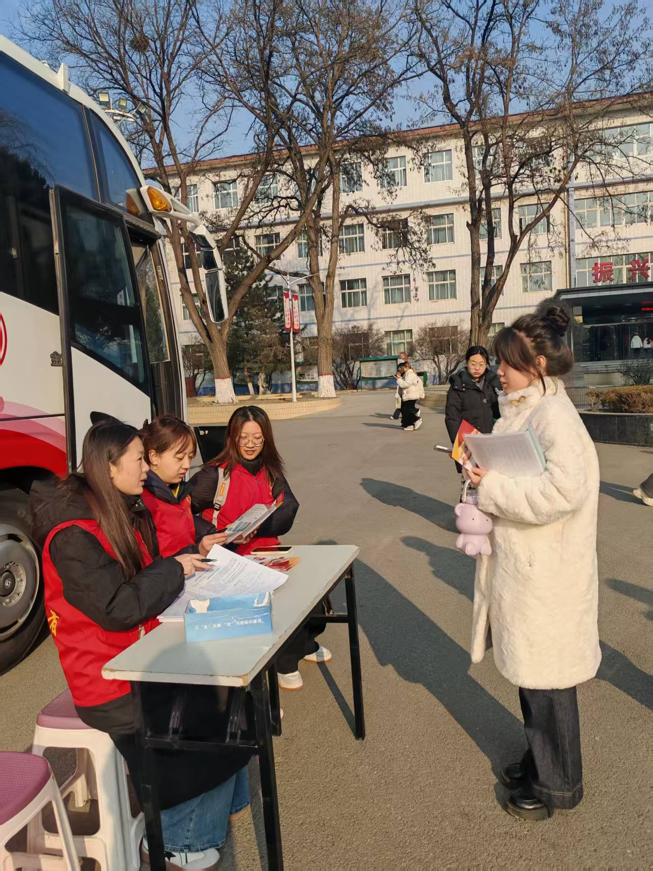活动现场,尽管气温低下,但是同学们却因为“互助,友爱”志愿精神的驱动,参与热情丝毫未减。报名区,志愿者们细致核对献血者信息,引导大家完成填表、体检等流程;采血车里,医护人员严格遵循操作规范,为每一位献血者进行血液采集,同时贴心地准备了饼干与热水以及一系列的纪念品,每一个环节中都闪耀着互助友爱的光芒。这次的活动既展现出了生命的续航能量,也体现了我院学子践行无偿献血凝大爱,奉献爱心显文明和以志愿力量共建美好社会的青春风采。