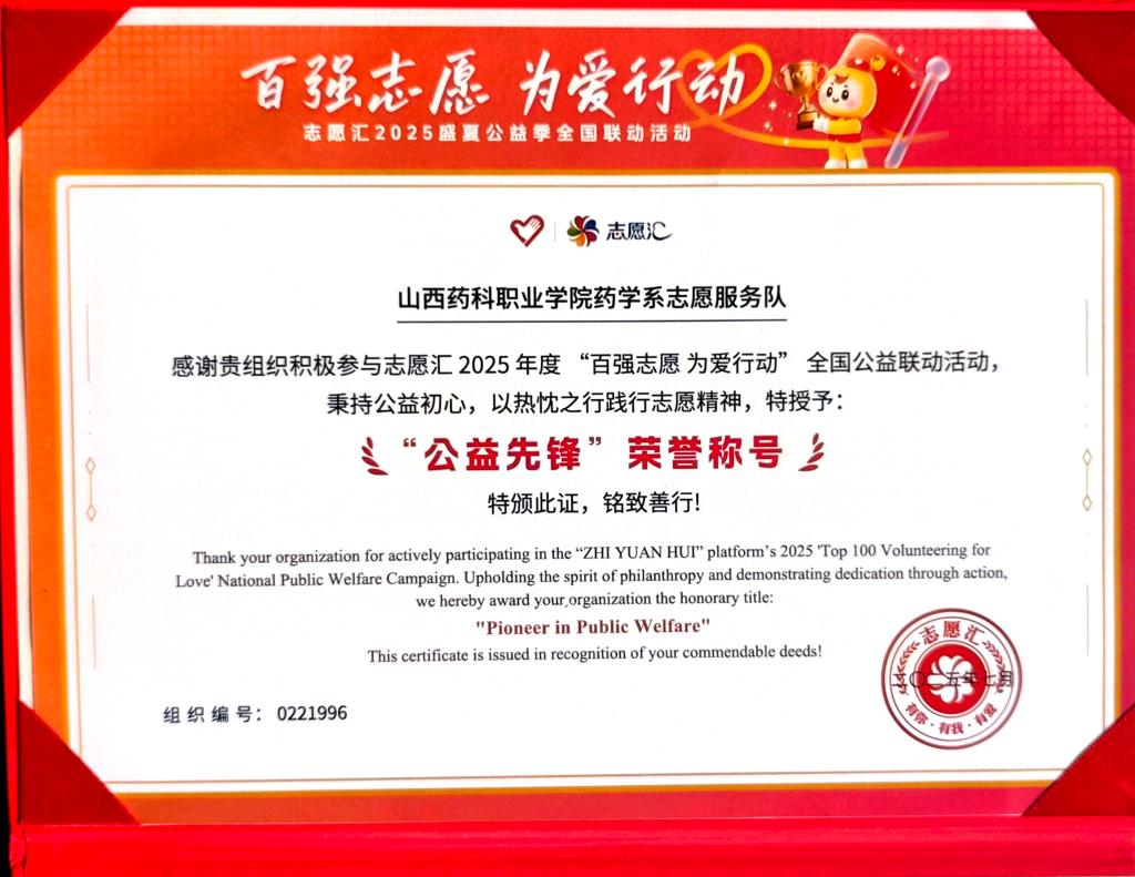 山西药科职业学院药学系志愿服务队自2013年成立以来,志愿征程硕果累累,已连续三年在志愿汇活动中斩获殊荣:2023年荣获“志愿汇之星”年度组织奖,2024年在“学雷锋月”全国公益联动活动中表现优异,荣获“优秀志愿服务队伍奖”称号,2025年又获得“公益先锋”荣誉称号。每一份奖项都是团队践行公益初心的生动注脚。未来,我们将继续深耕志愿领域,投身更多公益事业,在服务社会中锤炼本领、积累经验,让志愿之花在校园内外绽放得更加绚烂,携手共创志愿事业的辉煌明天!