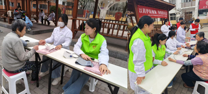 签约仪式结束后,志愿服务活动同步开展。在健康宣传区,药学系刘文娟、王增仙、胡清宇三位专业老师带队,10名学生志愿者化身“健康使者”,精心开展“以药护航健康,用爱服务社区”医药安全志愿服务。志愿者们主动向前来咨询的居民发放健康宣传资料,围绕高血压、糖尿病等常见慢性病的防治知识、合理用药、日常膳食搭配、科学养生等群众关心的热点问题,用通俗易懂的语言开展科普宣讲,耐心细致地为居民答疑解惑,切实将专业知识送到群众身边。