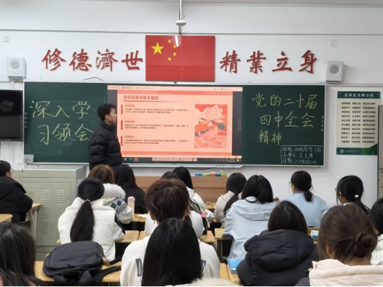 团课伊始,团支书围绕全会核心精神展开宣讲,重点学习了《中共中央关于制定国民经济和社会发展第十五个五年规划的建议》的框架体系与核心要义,深入阐释了中国式现代化的内涵特征、共同富裕的实践路径、科技创新的战略意义等关键内容,帮助青年学子从顶层设计中看清国家发展方向与个人成长的内在关联。
