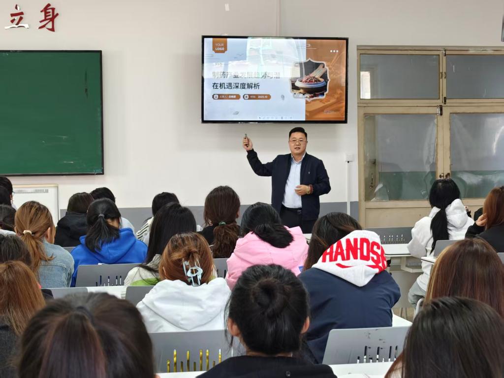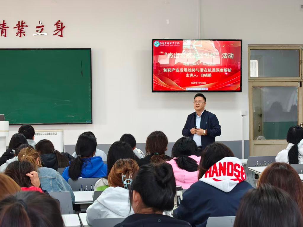 2025年10月15日,制药系举办“杰出校友回母校”活动,特邀上海兮儿健康科技有限公司总经理白晓鹏重返母校,为师生带来一场题为“制药产业发展趋势与潜在机遇深度解析”的专题讲座,为在场师生呈现了行业发展的全景蓝图。